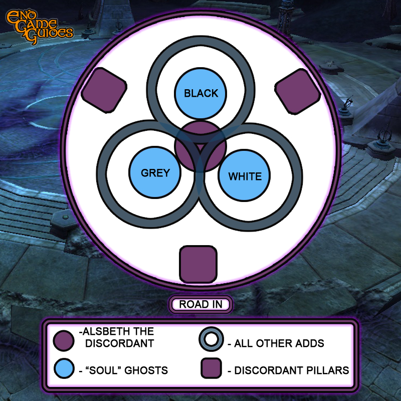 Alsbeth the Discordant will be tanked in place, she does not move from her starting position except to rise straight up, triggering phases. She needs to be turned away from the raid; all raid members need to pay attention to which way she is facing throughout the fight for there is quite a lot of movement. The raid needs to spread out as much as possible to avoid taking too much damage from the Chain of Discord.