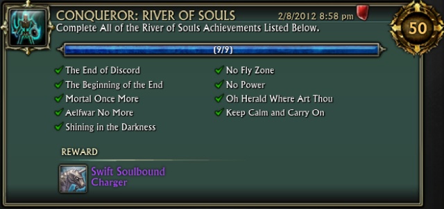 Completing this cheevo will grant you the Swift Soulbound Charger Mount.