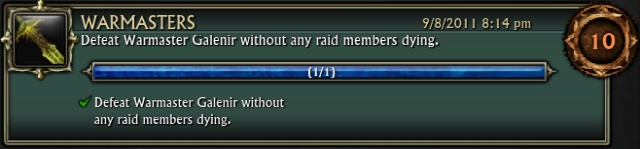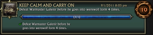 The fight continues with Warmaster Galenir swapping forms until his health is at 15% at which time he remains in Werewolf form and the Mote of Calm is not spawned. All DPS need to burn him at this point. Remember during this period abilities will cost an extra 25% energy, so the bard and archon need to make sure their regens are off of cooldown for this burn phase and raid members should make sure to have a regen or pot available if needed.